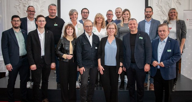 1. Vizebgm. Thorsten Wohleser wurde gemeinsam mit den Vertreter:innen der zwölf anderen Städte von Ministerin Leonore Gewessler an Bord der Mission „Klimaneutrale Stadt“ begrüßt. (© Anna Pirato – SIR)
