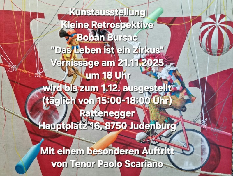 „Das Leben ist ein Zirkus“! In den Räumlichkeiten des ehemaligen Schuhhaus Rattenegger eröffnete Boban Bursac eine beeindruckende Retrospektive seiner Werke der letzten 30 Jahre. Viele Freunde und Liebhaber seiner Kunst folgten aus Nah und Fern der Einladung. Ein weiteres Highlight der Vernissage war die stimmgewaltige Darbietung von Tenor Paolo Scariano.