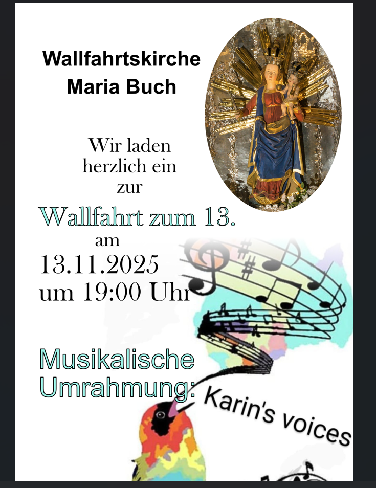 Donnerstag, 13.11.2025, 19.00 Uhr, Wallfahrtskirche Maria Buch mit musikalischer Umrahmung: Karin´s voices