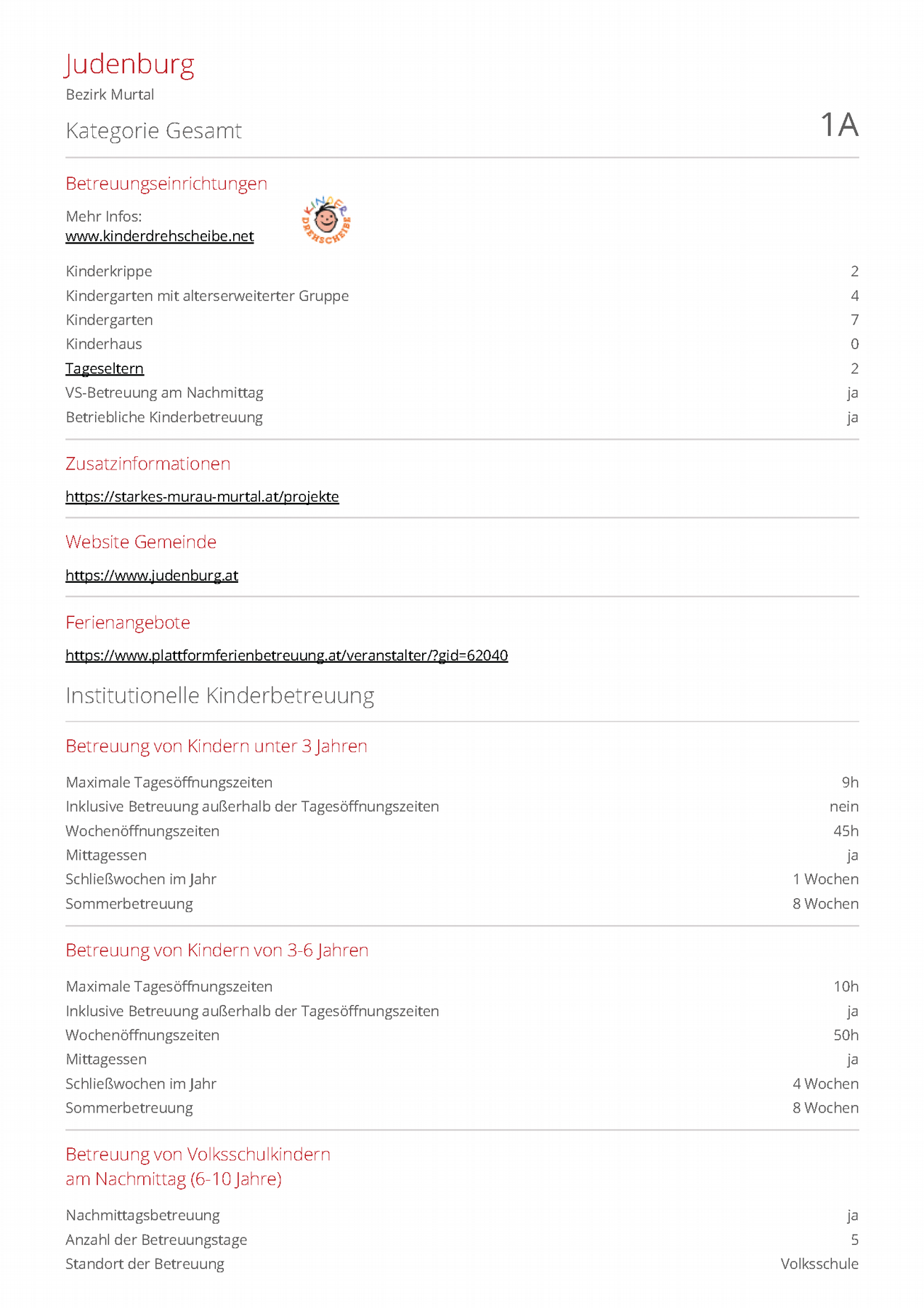 Der nunmehr 10. steirische Kinderbetreuungsatlas der AK Steiermark ist auch 2023 in digitaler Version erschienen und ermöglicht eine differenzierte Darstellung der steirischen Kinderbetreuungslandschaft. Judenburg wurde heuer in die höchste Kategorie 1A aufgestuft.