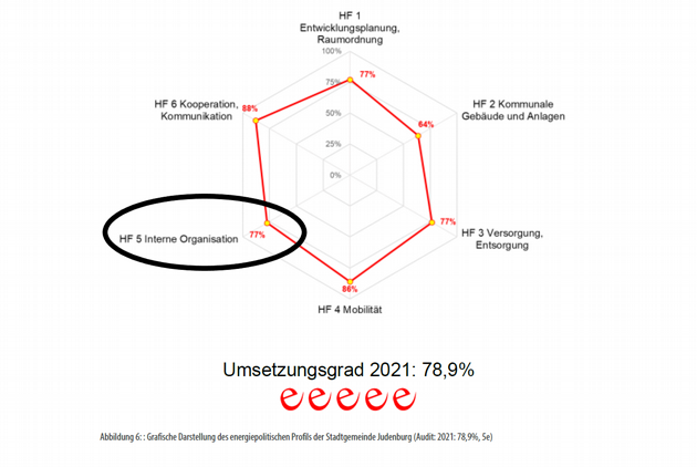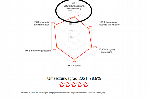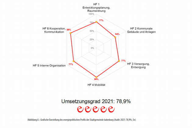 Das Spinnendiagramm zeigt die sechs Handlungsfelder und den Erfüllungsgrad von Judenburg. Eine langjährig aktive Gemeinde wie Judenburg zeichnet sich nicht durch einzelne isolierte Leuchtturmprojekte aus, sondern verfolgt quer durch die Bank eine vorbildliche Klimapolitik, die von vielen verschiedenen Akteurinnen und Akteuren getragen und umgesetzt wird. Dies zeigt sich in einem homogenen Profil mit einem möglichst hohen Umsetzungsgrad in allen Bereichen.