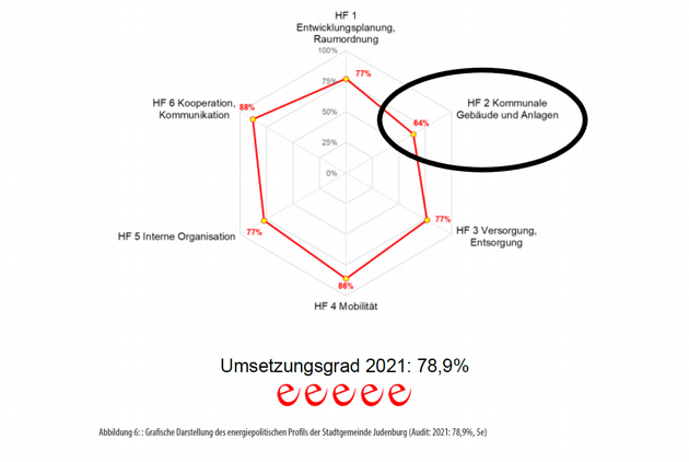 Das energiepolitische Profil der Stadtgemeinde Judenburg zeigt im Wesentlichen ein sehr homogenes Bild. Allein das Handlungsfeld 2 Kommunale Gebäude und Anlagen liegt nicht über 75%. Die Gemeinde erreichte auch bei diesem Audit das langfristige wünschenswerte Ziel, ein möglichst homogenes Bild mit möglichst hohem Umsetzungsgrad zu erreichen